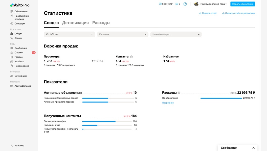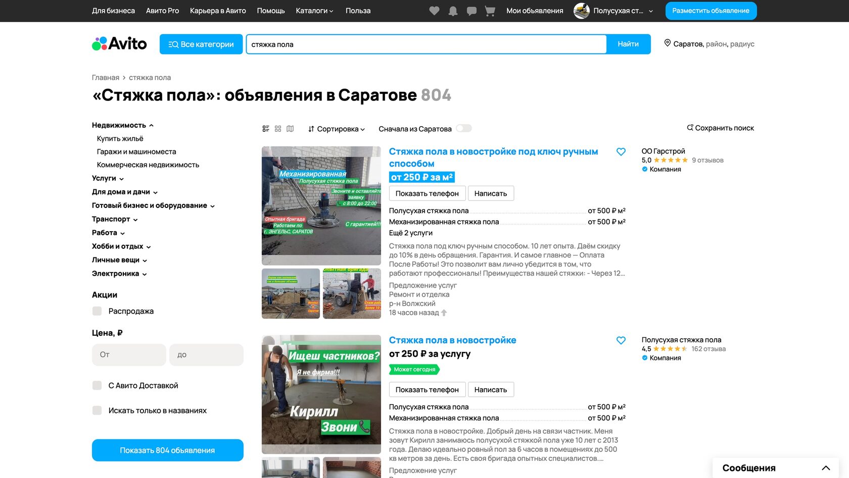 На тот момент, в марте 2023 года, в регионе было около 800 объявлений о стяжке полов на платформе Avito. Кроме того, во время предварительной беседы клиент сообщил мне, что, по его сведениям, в городе работают примерно 35 компаний, занимающихся этим видом деятельности. Это означало, что конкуренция в регионе не была слишком высокой.